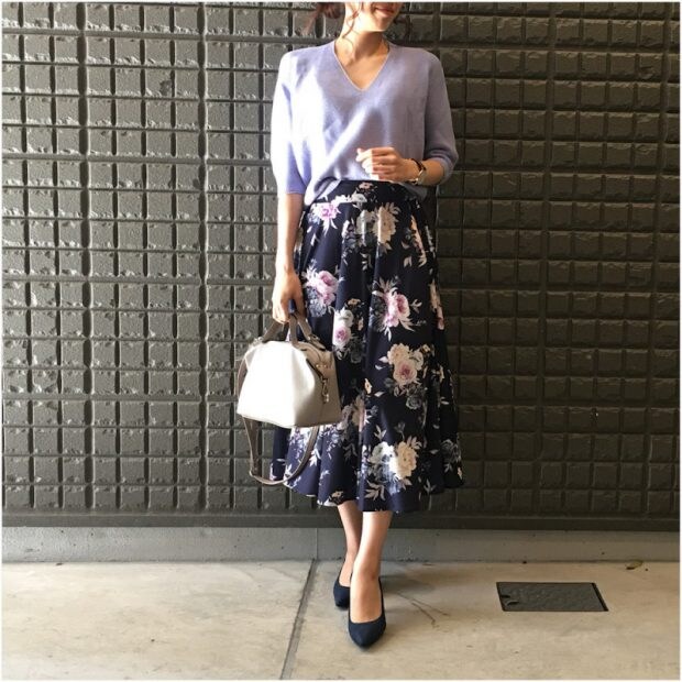 着ぶくれしないセーターは、もちろんスカートとも好相性。エレガントさが際立ちますね。