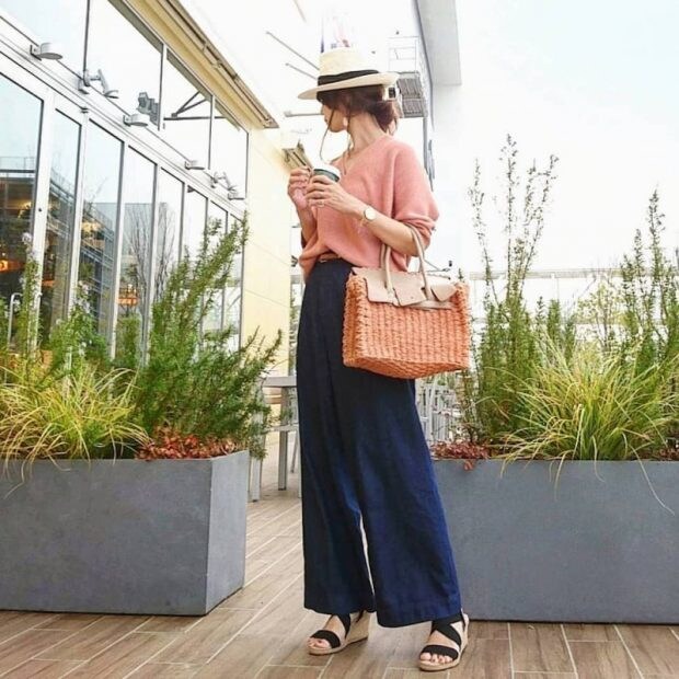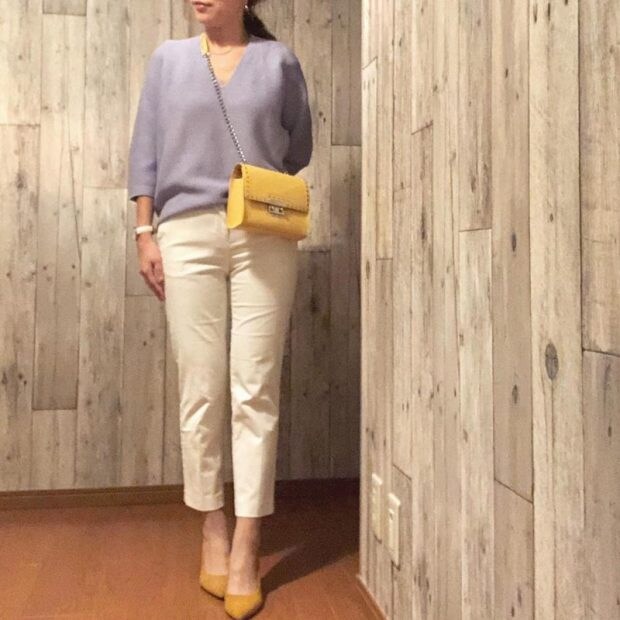 淡いカラーのパンツスタイルは、上品さを感じられる春色コーデに。バッグとパンプスの色を合わせることで、統一感が出ていますね。
