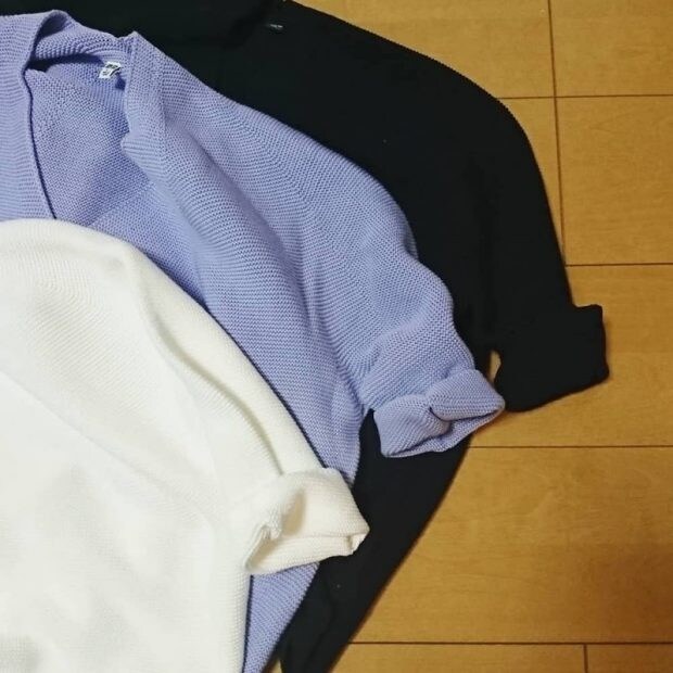 3DコクーンシルエットVネックセーターはオフホワイト、ライトグレー、ライトオレンジ、ネイビー、パープルの5色で価格は2,990円(税別)。店舗によっては既に完売のサイズやカラーもあるようです。気になった方は今すぐお店に行ってみてくださいね!
