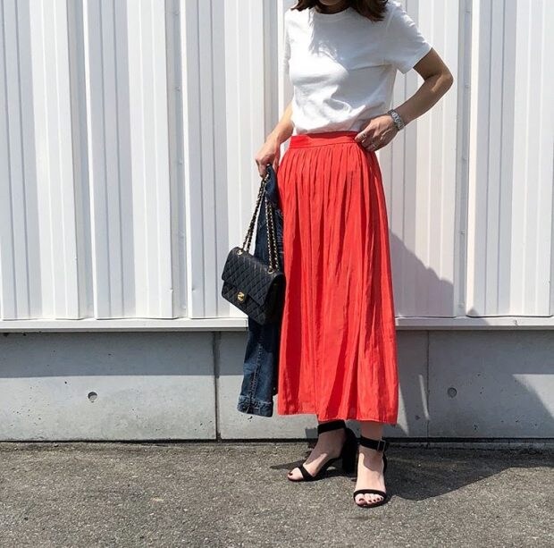 ホワイトのTシャツに、鮮やかなオレンジのスカートが、夏にぴったりの爽やかなスタイリング。Gジャンとの相性も◎。