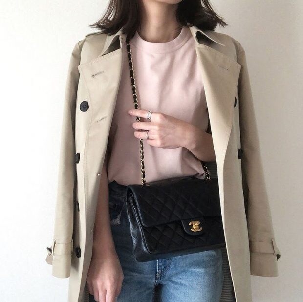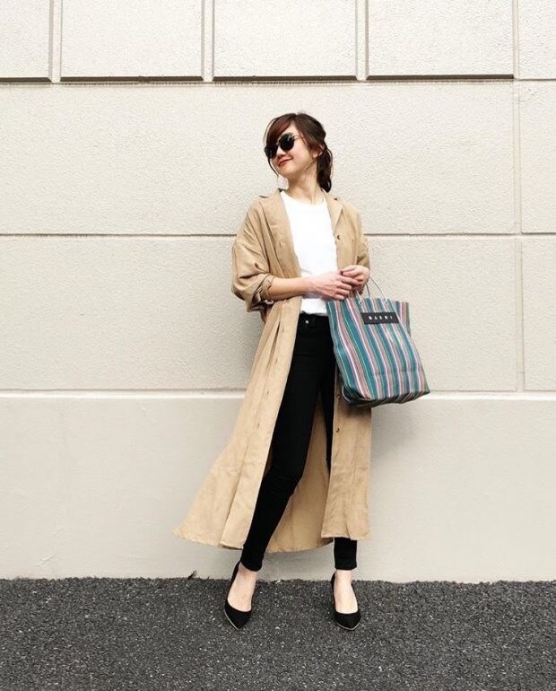 ブラックのスキニーと、ベージュのトレンチ、ベーシックな色味でまとめた大人シンプルコーデ。カラフルなバッグを差し色に。足元はヒールで、女度アップ!