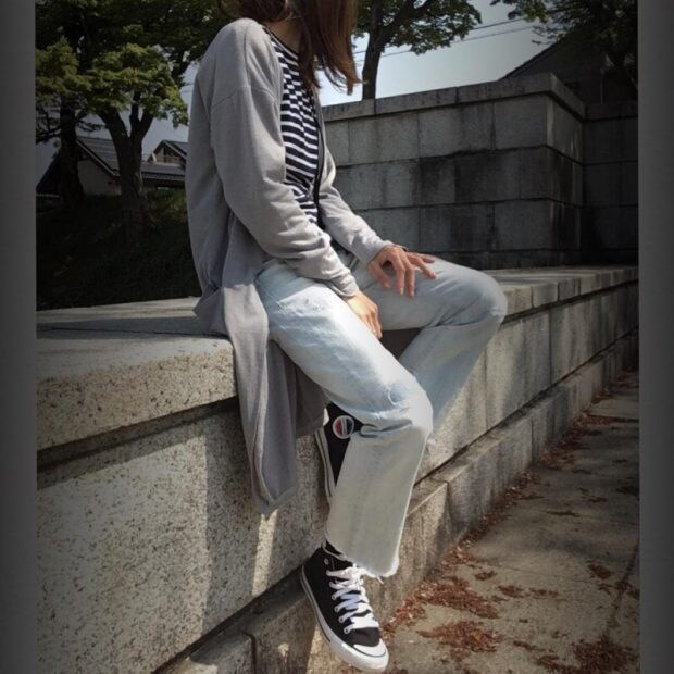 ボーダー&ワイドデニムでカジュアルテイストに着こなしていますね。動きやすいからオフの日にもぴったり!デニムのフリンジがオシャレ。