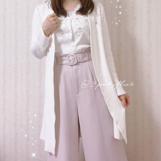 ワイドパンツもピンクを選んで甘いイメージに。mischmaschのロングカーディガンはレースショルダーが大人可愛いコーデに仕上げてくれます。