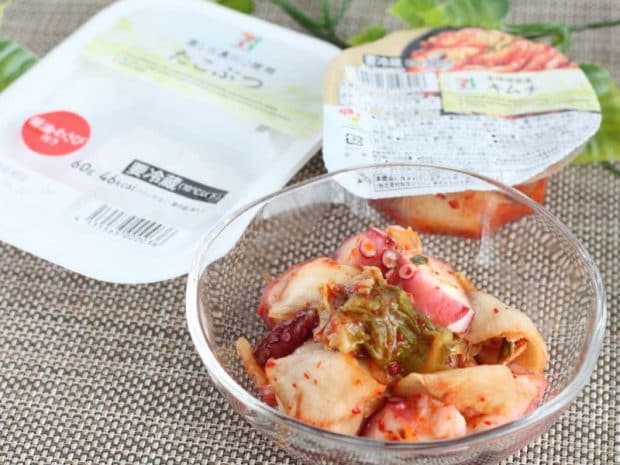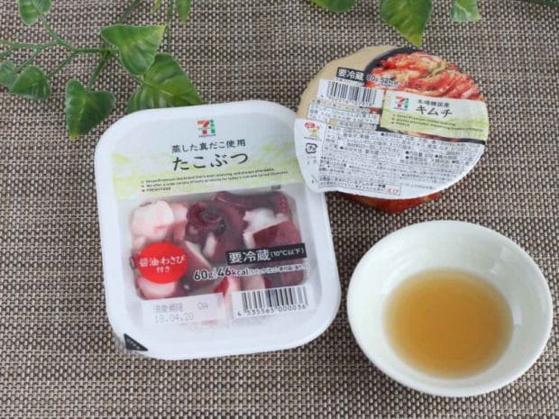 2つ目は、おかず系のオススメ「たこキムチ」。用意するのは、セブンのたこぶつとキムチ、そしてごま油。