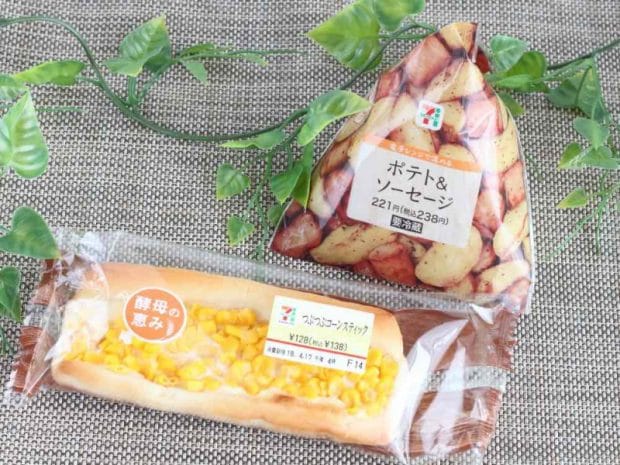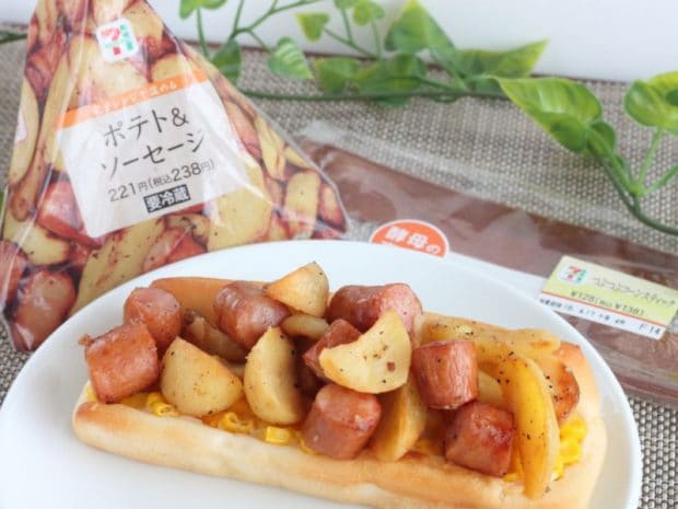 1つ目は「コーンポテマヨソーセージパン」! 用意するのはセブンのポテト&ソーセージとつぶつぶコーンスティックです。もしくはコーンマヨネーズパンでもOK。ポテト&ソーセージとパンは必ず温めるのがポイントですよ!