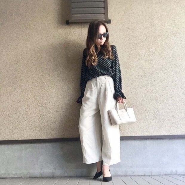ドットブラウスに合わせてレディな装いに。トップスはしまむらと上下プチプラプラコーデ。パンツのシルエットが美しいから、コーデが高見えするんです。