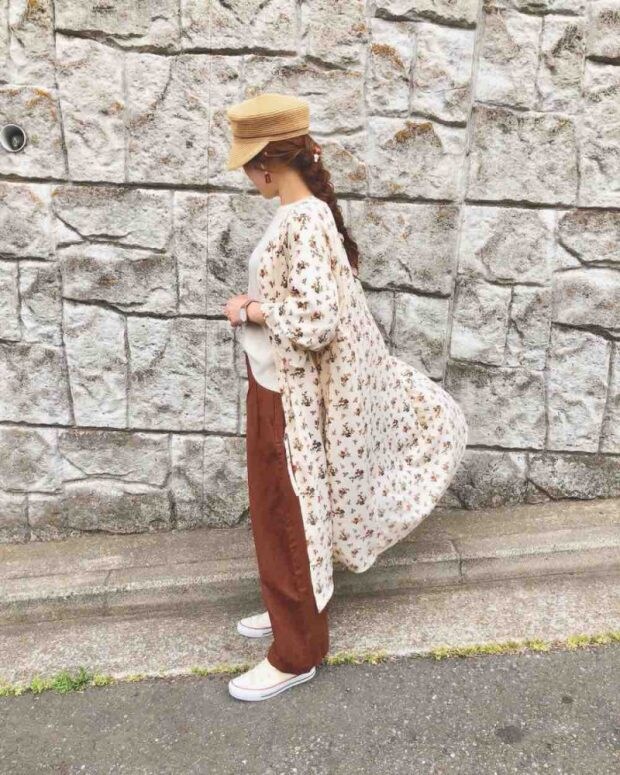 今買って、秋までガンガン使えるカラーをお探しならブラウンのチョイスがオススメ♪ 花柄のガウンに合わせて大人ガーリーな雰囲気に。夏は半袖ガウンで、秋はインナーをニットにしてとコーデの妄想が止まらない!
