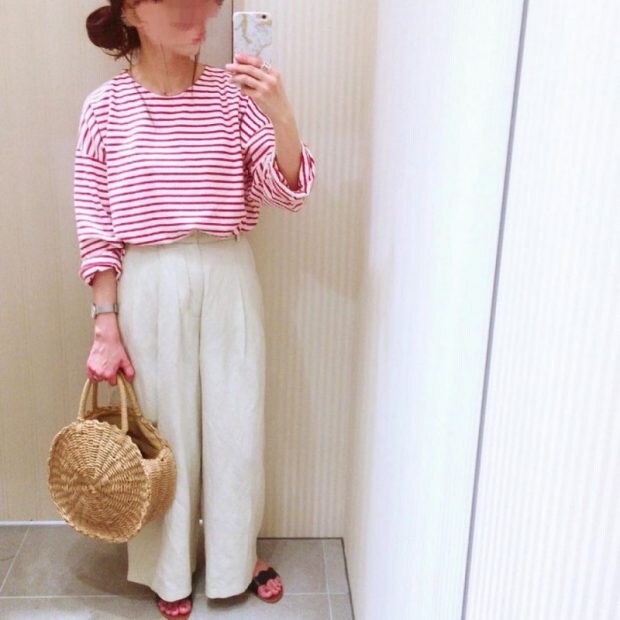 どんなカラーともマッチするナチュラルカラーが一番人気の様子。赤のボーダーTとのタッグで、簡単マリンコーデの完成♪