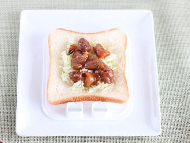 パンは500wレンジで30秒程度加熱しておきます。こうすることで、しんなりして後の作業が楽になりますよ。パンの上にキャベツとやきとり缶を乗せます。やきとり缶は半分程度で大丈夫!