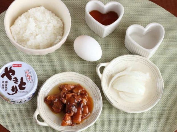 やきとり缶一缶、卵一個、玉ねぎ1/4玉、めんつゆ大さじ1(2倍希釈)、水大さじ2、ご飯を用意します。
