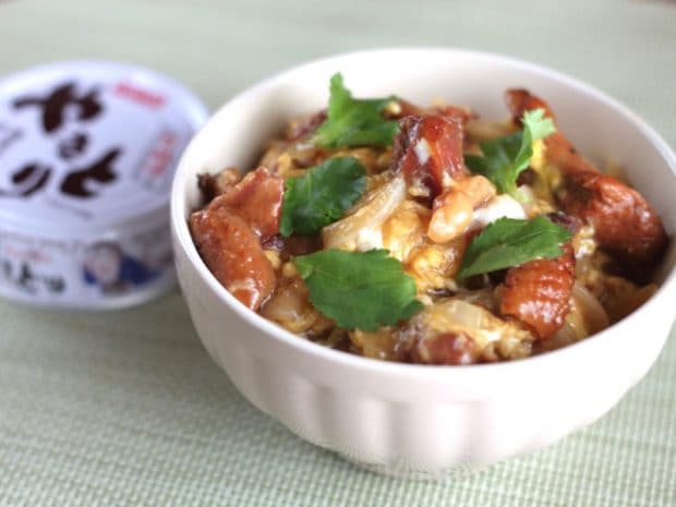 鶏肉にしっかり味が付いているやきとり缶を使うことで、テクニックいらずで濃厚な親子丼が完成! お肉が半生だった……なんて失敗もありません。アクセントに七味をかけてピリッとさせてもおいしいですよ〜。