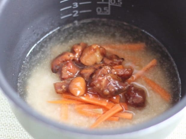 あとはやきとり缶の具、人参、生姜を上に乗せ、炊飯器のスイッチを押すだけ! 炊きあがったら軽く混ぜて完成です。