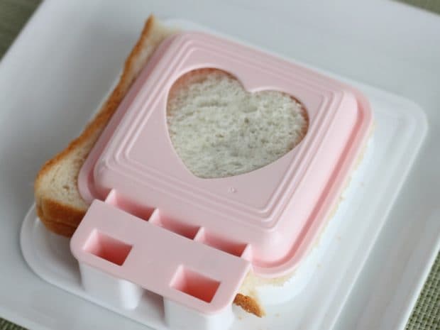 もう一枚のパンを上に乗せ、抜き型をセット! グッと押し込むとでパン同士がくっつくので、抜き型を押さえ、パンの耳を切っていきます。手で簡単にできますよ。抜き型から外し、トースターで焼けば完成!