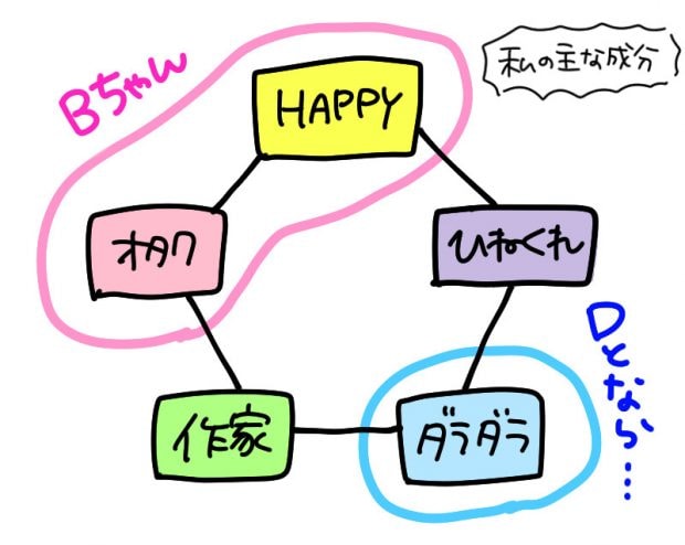 このように、相手によってテンションや共有できる話が違うから、それぞれが私に持つ印象が違うだけで、全部私の一部なんだと。だから「○○とはこういうところが合わないから嫌い!」と一点だけ見るより「ここは合わないけど、アレの話は楽しいし、コレの面では共感できる」と相手によって共有したいものを把握して、自分を構築している要素を分散させるイメージを持つようにしたら、楽になりました。