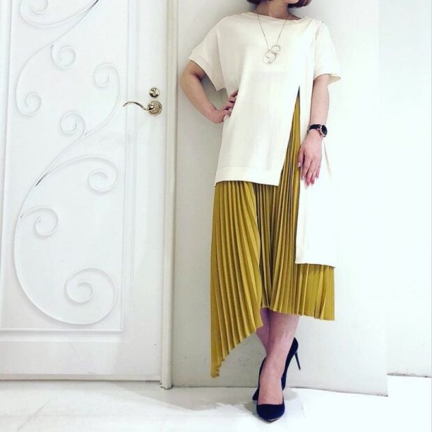 フロントに大胆なスリットが入っているアイテムもステキ。プリーツスカートを合わせて、大人の遊びココロ溢れるスタイリングを楽しんで。