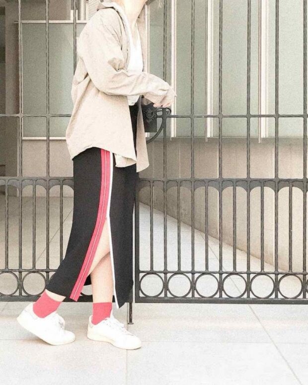 今季のトレンドスポーツミックスもスリットをプラスすることで、女性らしくキマリます。こちらのスリットスカートはZARAのものなんですって。