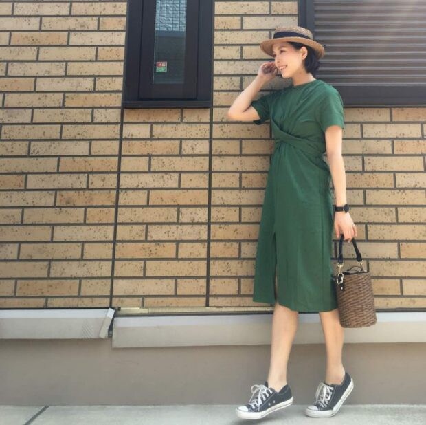目を引くグリーンのワンピースは、フロントに長めのスリットがポイント! ヒールに合わせると、ちょっとフォーマルな印象になりがち。スニーカーとストローハットでハズして、コーデにヘルシーさをプラスして。