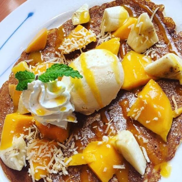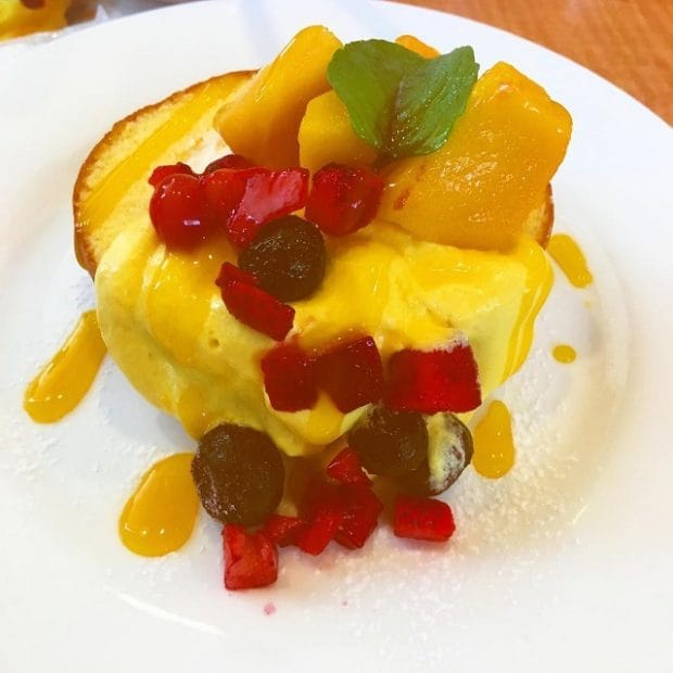 マンゴー仕立てのパンケーキ。ふかふかのパンケーキに、フレッシュマンゴーとミルキーなマスカルポーネクリームが散りばめられています。マンゴーソルベとバニラアイスの2種類のアイスクリームが乗っているのも嬉しいポイントです。