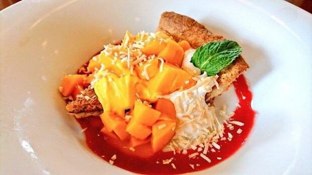 ココナッツ風味のタルトに、ごろごろとしたマンゴーをたっぷりと。あふれんばかりのマンゴーで、タルトの姿が隠れてしまっています(笑)。お皿に敷かれたラズベリーソースの甘酸っぱさがアクセントに。
