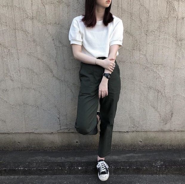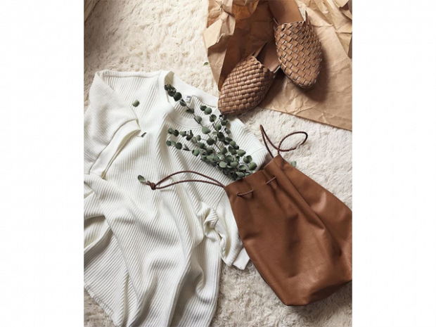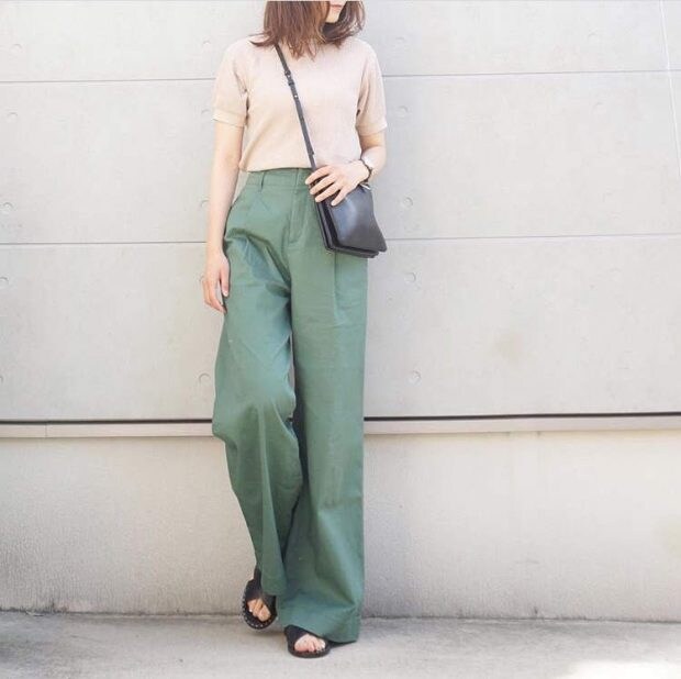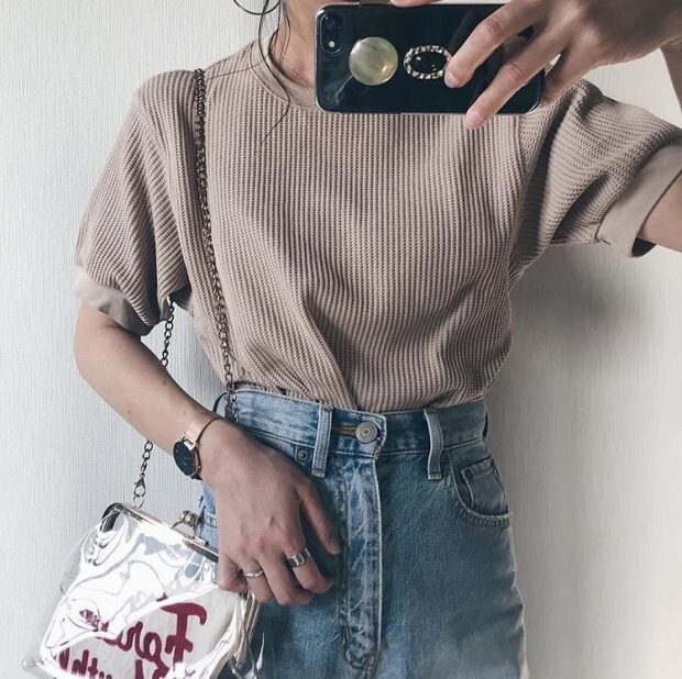 Tシャツとパンツで、すっきりとまとめられたコーデ。シンプルながらも、ワッフル織りや、袖がパフスリーブのように少しボリュームがあることで、表情のあるスタイリングに。