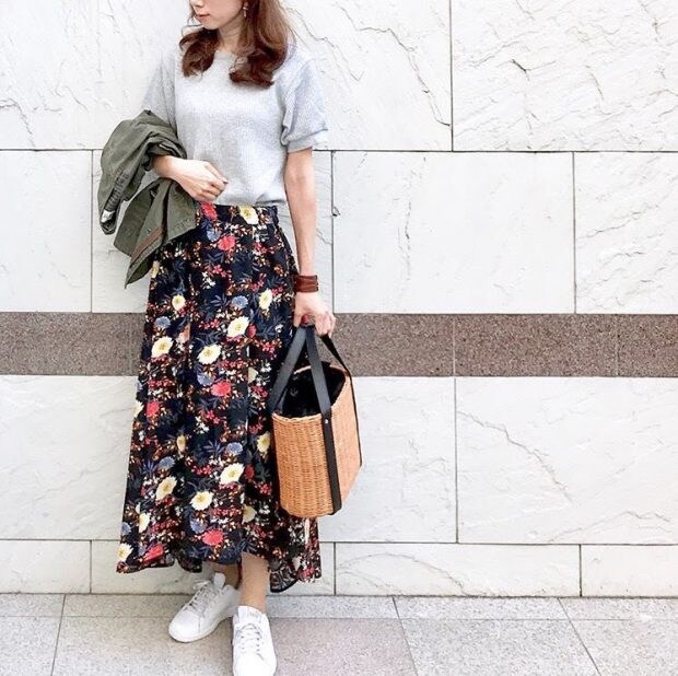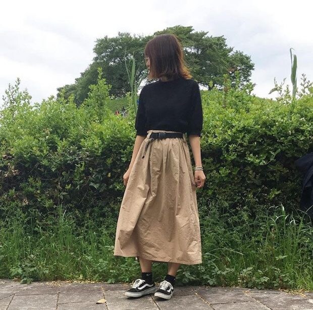 パンツだけでなく、スカートなどのレディライクなコーデとも合わせやすいのが嬉しいですね。オン・オフを足元で切り替えれば、平日も休日も◎。