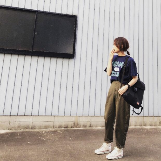 オーバーサイズのTシャツとキュッと締まったハイウエストがベストマッチなコーデ。シンプルなスタイルですが、旬のエッセンスも加わり、バランス良く決まります!