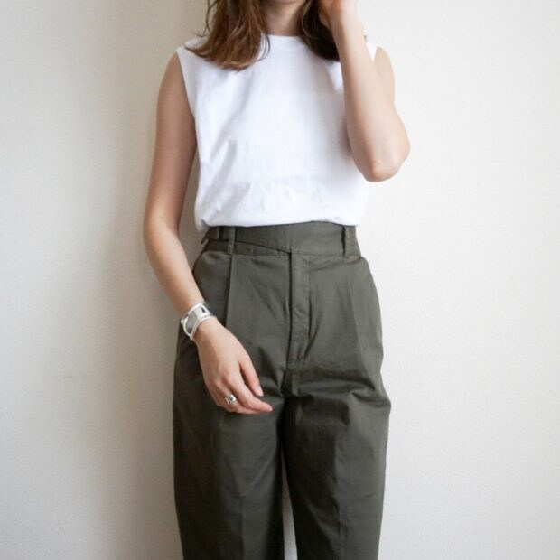 シンプルなホワイトのトップスをチョイスすれば、シックな印象に。張りのあるチノ素材はきちんと感も狙えちゃいます。