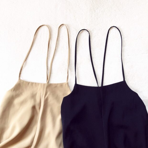 肩紐を細く華奢にすることで大人っぽい仕上がりに。柔らかくてさらりとした生地なので、すとんとしたシルエットになって脚長効果も期待できそう。