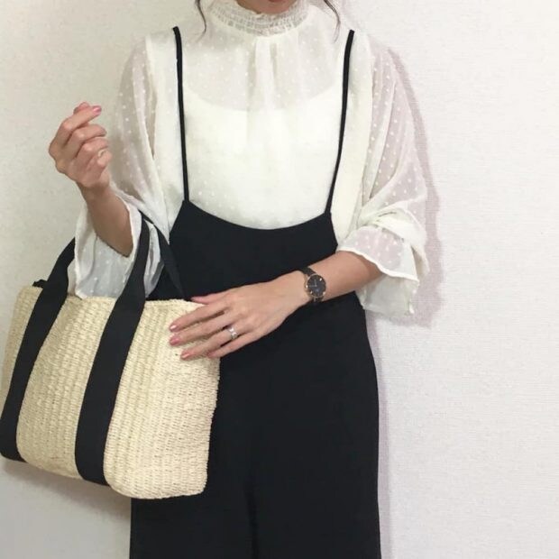 モノトーンで統一したコーデだからこそ、サロペットとフリルブラウスのデザインが際立ちますね!