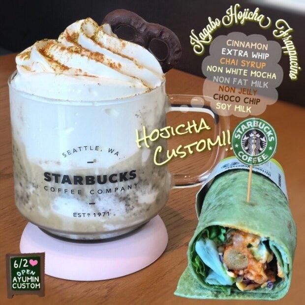 こちらはInstagramの「 #あゆみんカスタム 」で定番になっている「チャイ+チョコ+シナモン」の組み合わせです。こちらをほうじ茶フラペチーノとカスタム!
