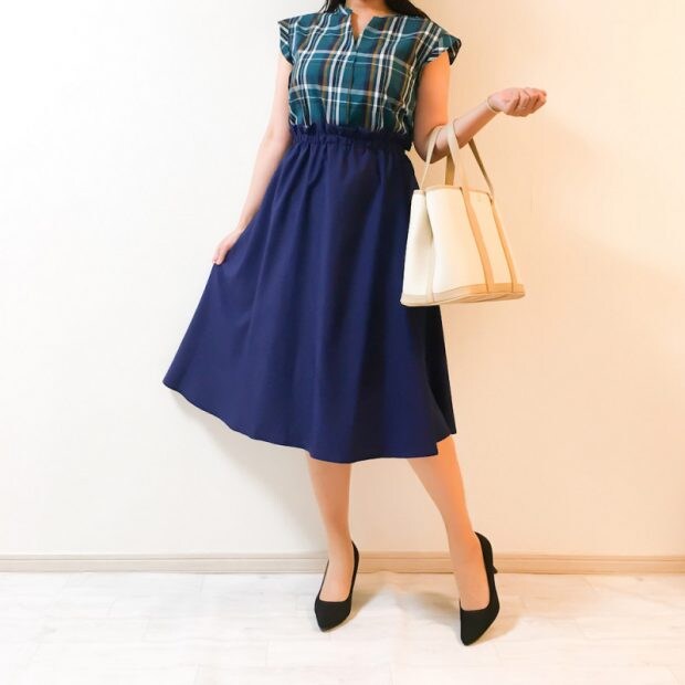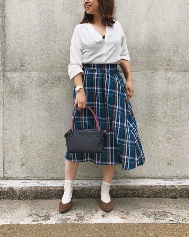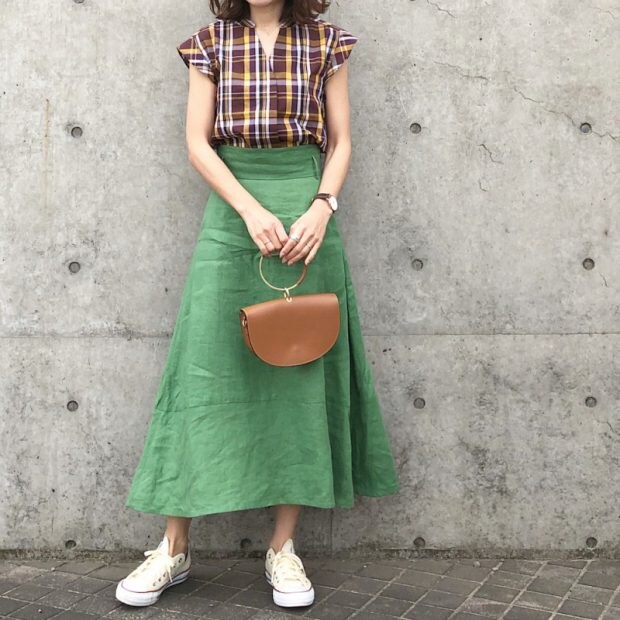 鮮やかなグリーンのチェックは、キュッとウエストの絞まったロングスカートで絶妙なバランスに。ブラックのパンプスもスタイルアップに一役かってくれます。