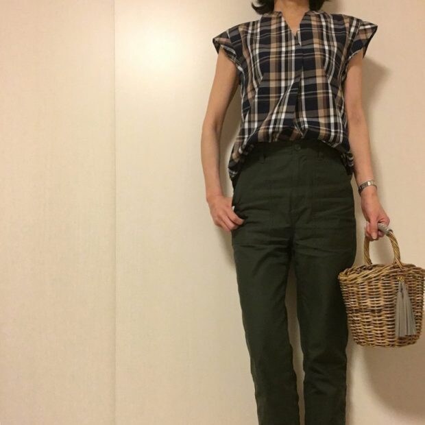 着回し力抜群のネイビーは、メンズライクなパンツと合わせて。かごバッグがアクセントになって涼し気です。