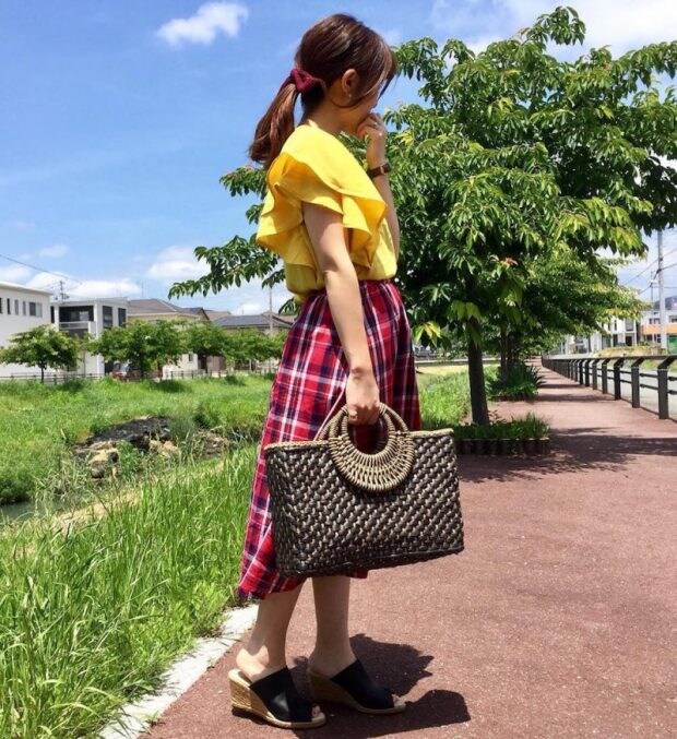 パッと目を引くイエローとレッドの組み合わせは、初夏の陽気を感じさせてくれるコーデに。落ち着いたバッグとシューズで全体の雰囲気を引き締めてくれる効果もありますね。