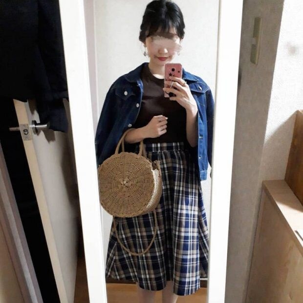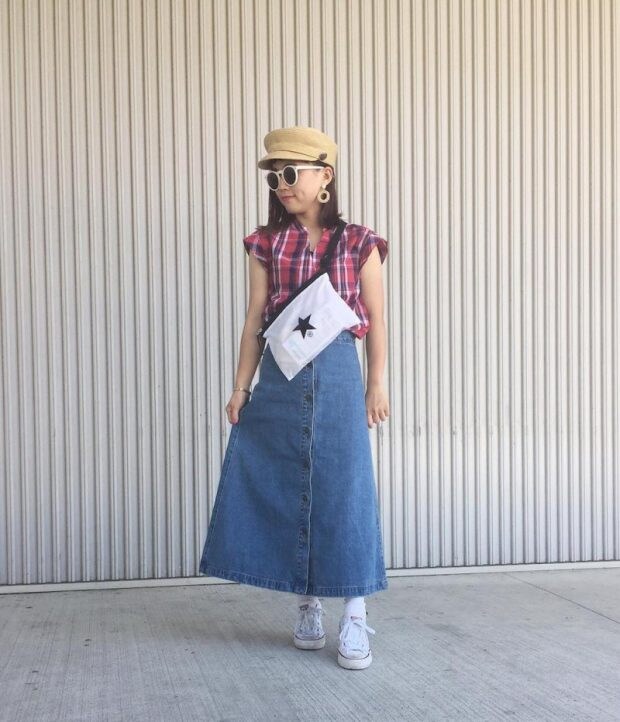 落ち着いたブラウンのチェックブラウスは、スニーカーとも好相性。上品な印象のブラウンのバッグと合わせると、統一感が出ますね。