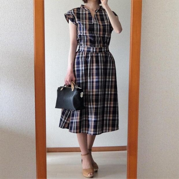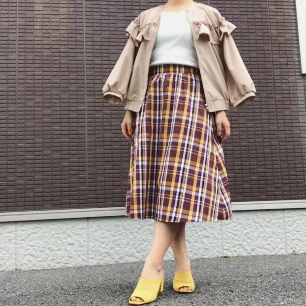 マドラスチェックブラウスとマドラスチェックフレアミディスカートのセットアップで、ワンピースのように楽しむオシャレ女子も! セットアップでもセパレートでも使えて、着こなしの幅が広がりますね。
