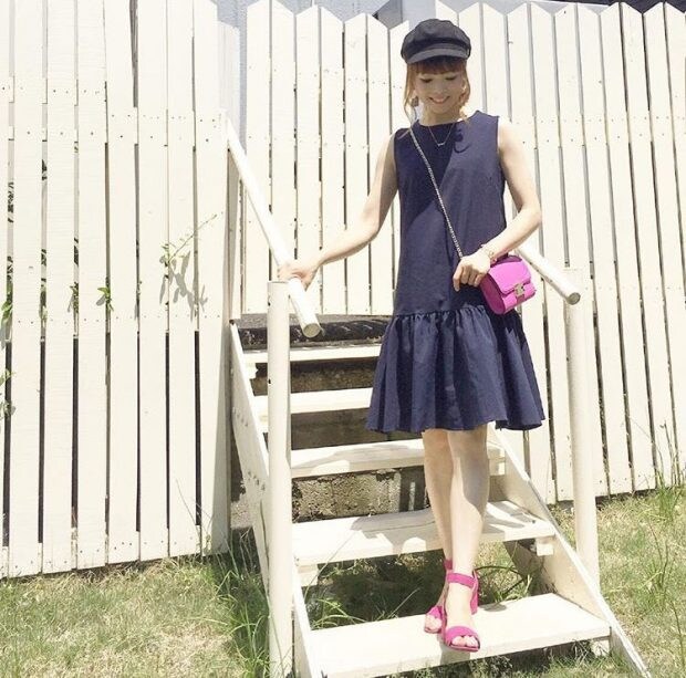 ネイビーのワンピースの上品コーデに、サンダルで差し色をプラス。バッグもピンクで統一すれば、コーデにまとまりが生まれます。