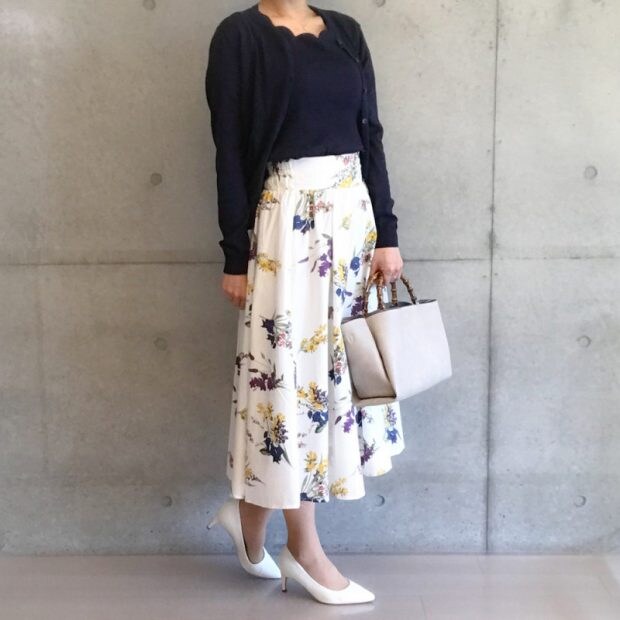 さっと羽織れば紫外線対策になる上にオシャレに見える万能アイテム。爽やかな花柄スカートとホワイトのパンプスを黒トップスで引き締めた技ありコーデです!