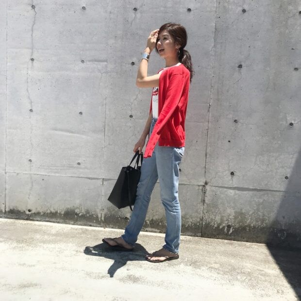 シンプルなデニムとTシャツに差し色の赤を投入すれば、明るい夏の着こなしに! UVカットクルーネックカーディガンはオフホワイト、グレー、ブラック、ライトオレンジ、ダークオレンジ、クリーム、ブルー(62)、ブルー(66)、ネイビー、パープルの10色展開。価格は1,990円(税別)です。