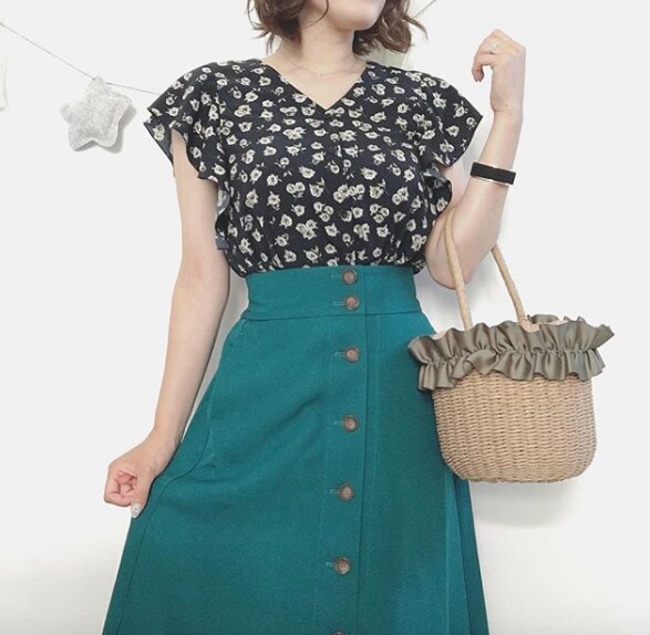 小花柄が可愛いブラウスは、Vネックで小顔効果も期待できる1枚。デコルテがすっきり見えるおかげで小花柄を大人っぽく着こなせ、カジュアル派も取り入れやすいデザインです。カラー展開はオフホワイト、グリーン、ネイビーの3色。値段は1,490円(税別)です。