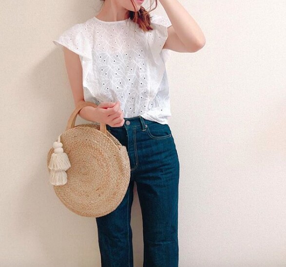 カジュアルに着られるコットンレースが夏らしい1枚。厚みのある素材で肉感を拾いにくく、二の腕をすっきり見せてくれます。カラー展開はオフホワイト、ダークブラウン、イエロー、ネイビーの4色。お値段は990円(税別)です。