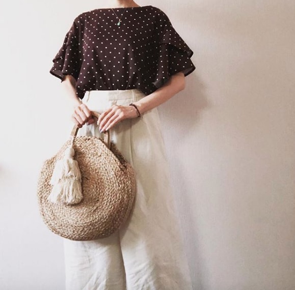 今年のトレンドであるドット柄で、細見えが叶うトップス。2段の立体的なフリルが、二の腕をほっそり見せてくれます。ジャージー素材だから着心地も抜群。カラーはオフホワイト、ブラック、ダークブラウン、ネイビーの4色展開。これで590円(税別)は買いです!
