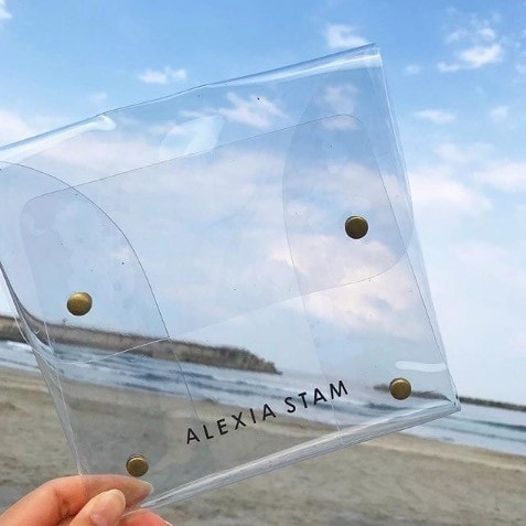 「ALEXIA STAM」のロゴと、ヴィンテージっぽいボタンがおしゃれなクリアポーチ。サングラスや日焼け止めなどを入れて、ビーチに繰り出したくなりますね。他にも小物を整理するポーチとして、普段使いにもバッチリです。サイズは、(約)ヨコ18.5cm、タテ18cm。価格は、850円(税込)です。