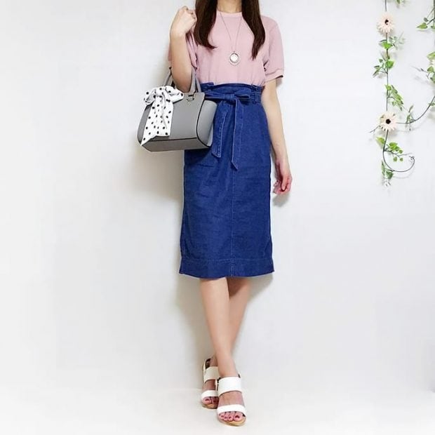淡いピンクとスカートをチョイスすれば、カジュアル感がやわらいで一気にフェミニンな雰囲気に。ワッフルクルーネックTはオフホワイト、グレー、ブラック、ピンク、レッド、ベージュ、ブラウン、グリーン、オリーブ、ネイビーの10色で価格は1,500円(税別)です。