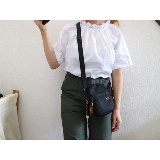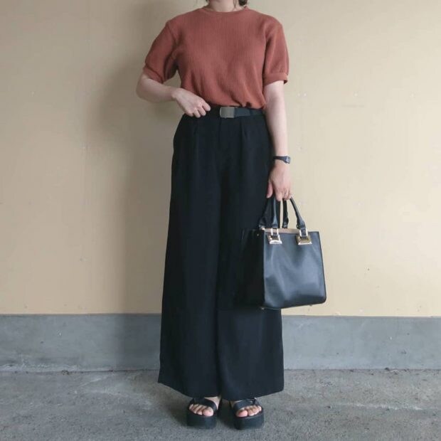タイトなトップスとふんわりボトムスは好相性。パンツと同系色のアクセサリーやバッグで統一感が出ますね。