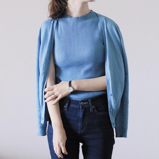 ユニクロで毎年人気のUVカットシリーズの「リブノースリーブセーター」は、細リブですっきり着こなせる1枚です。お値段は990円(税別)。なお、上に同色の「Vネックカーディガン」を羽織ってアンサンブルとしての着こなしもできるのですが、こちらは残念ながら現在品切れ状態のようです。