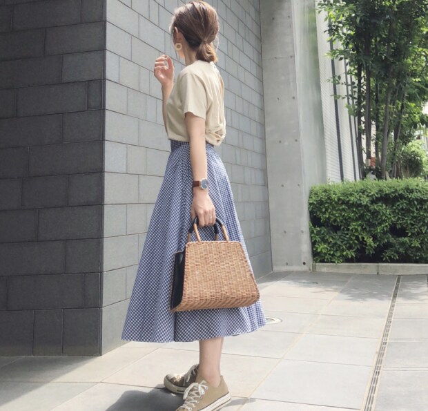 ストライプ、ボーダーと共に爽やかな印象を与えてくれる柄アイテムといえば、ギンガムチェック。動くたびにひらっと裾が揺れるスカートで寒色を取り入れれば、涼しげな着こなしを約束してくれます。ユニクロの「サーキュラースカート」は、シルエットが美しく、スニーカーに合わせてもバランスよく着こなせるアイテム。お値段は2,980円(税別)です。