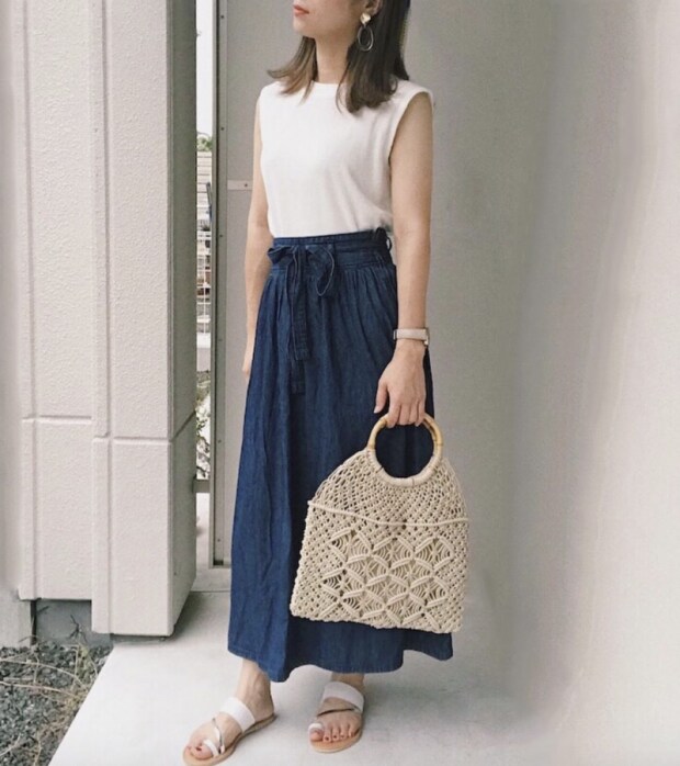 休日コーデの定番、デニムも立派な寒色アイテムです。風を通すスカートで取り入れると涼しげな印象を演出できますよ。ロング丈なら、休日モードなリラクシー感が出てGood! GUの「デニムウエストリボンフレアロングスカートSB」のようにウエストリボンが付いたタイプだと、トップスをINしただけでメリハリのある着こなしが叶います。お値段は990円(税別)です。
