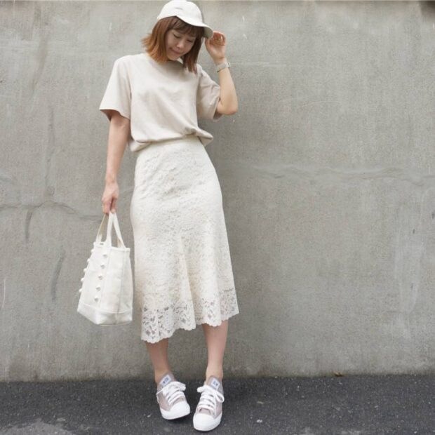 清楚なレーススカートは、クロップドクルーネックTと合わせてカジュアルダウン。ワントーンで揃えることで、カジュアルモードも大人な雰囲気かつ軽めな印象に仕上がるんですね。