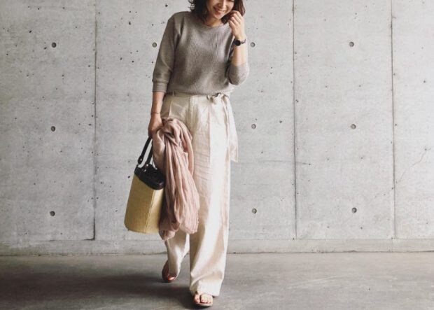 大人気のワッフルTと涼やかなリネンパンツとの組み合わせも◎。淡めカラーの配色が、爽やかさを感じるスタイリングに導くコツ。