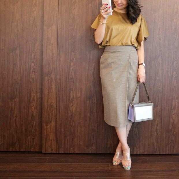 秋に向けてガンガン使えそうなチェックナロースカートを使ったコーディネートも良い感じ。二の腕の華奢みせが叶うマーセライズコットンTと合わせて、オフィスコーデにもぴったりなスタイリングに。
